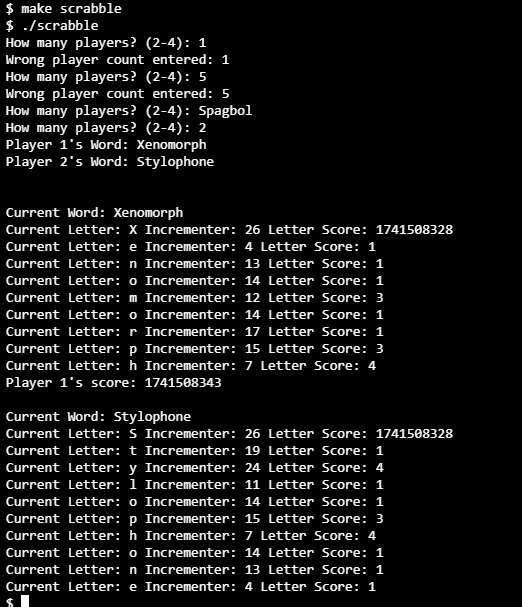printf("Player %i is the winner! score: %i\n", winner + 1, word_scores[winner]);