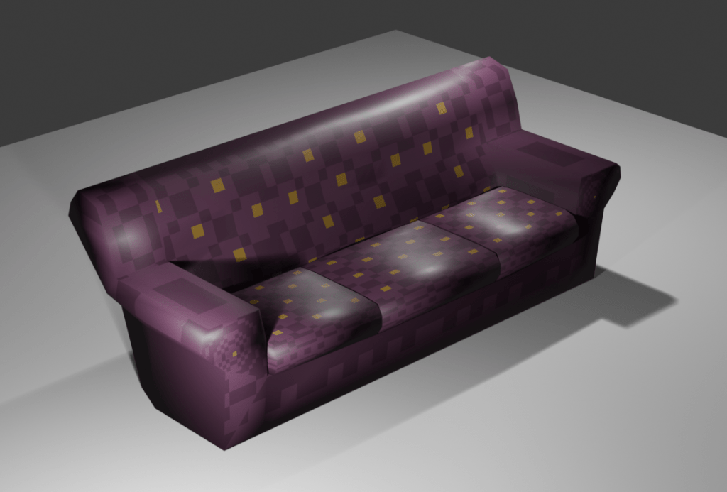 After this I set about creating some basic pixel art textures, attempting to create a “Winchester” style pinned cushion sofa, the results of this took longer (an hour) and were unsatisfactory; I learned a lot about UV mapping though!