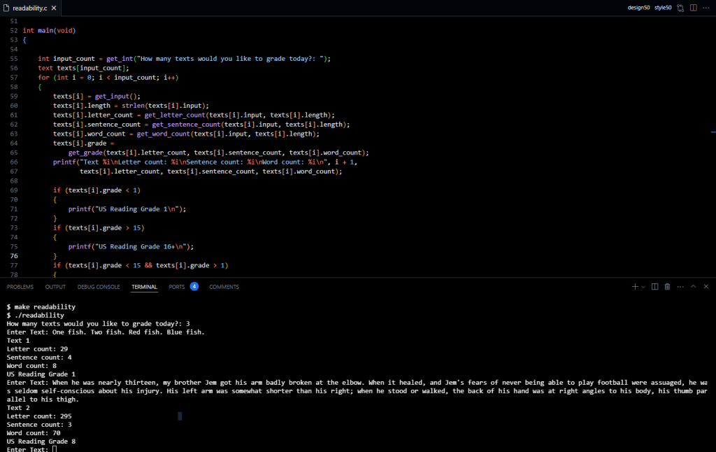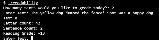 get_grade(texts[i].letter_count, texts[i].sentence_count, texts[i].word_count);